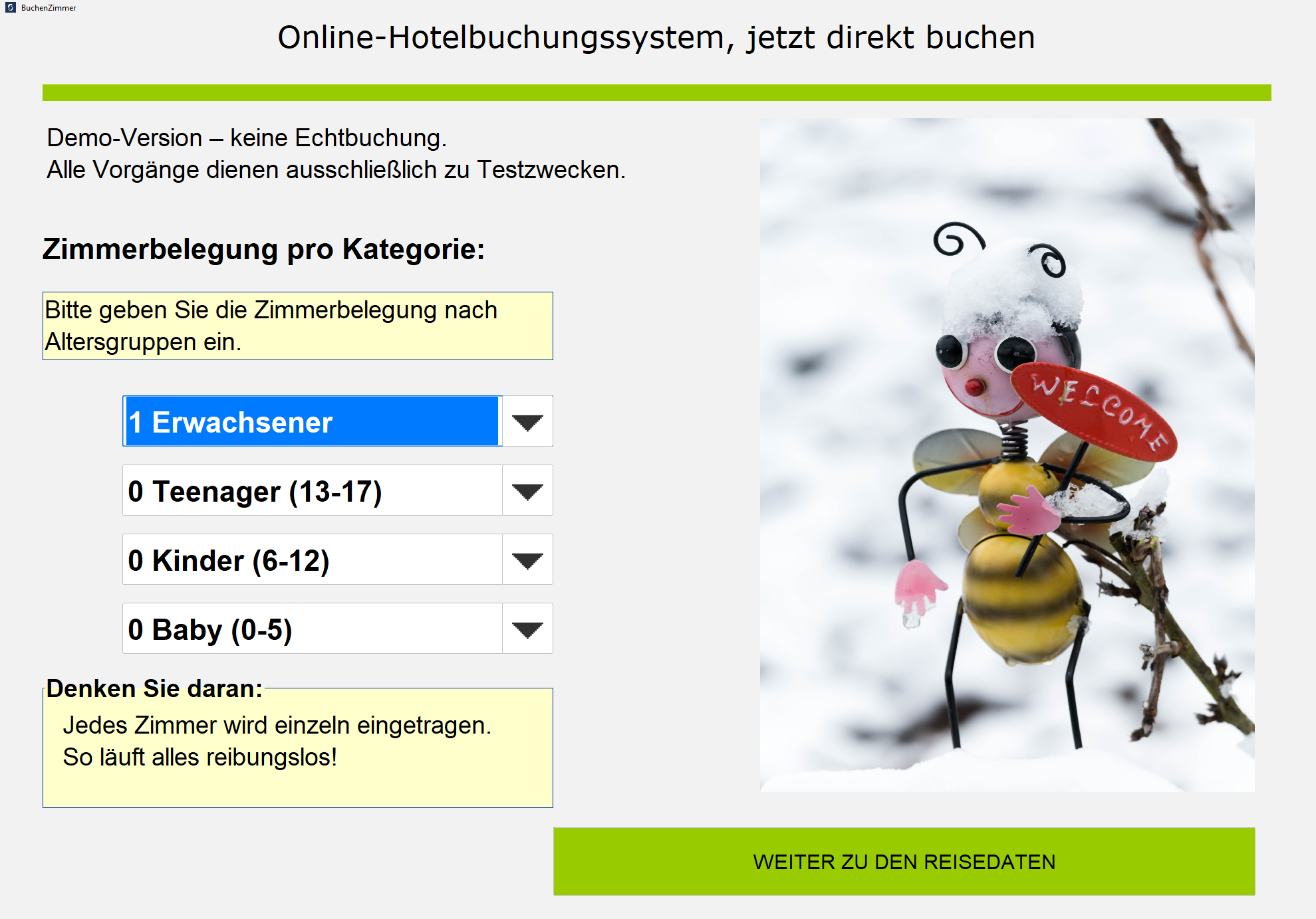Durch unsere Demoversion haben Sie die Möglichkeit, unsere Software-Module auf Ihre Bedürfnisse hin zu prüfen. Sehen Sie sich einfach direkt unsere Demo an: Online Buchungstool - oder .
